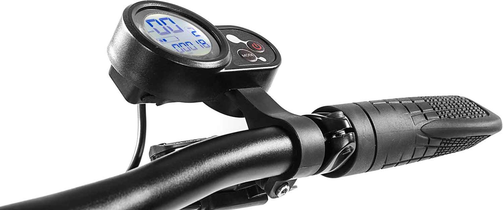 The throttle grip consists of a finger rip with integrated LCD display which shows the current speed, daily and total kilometers, travel time as well as the current charge status of the battery in the bar graph and the current voltage of the battery in volts. For charging mobile devices, a USB charging jack is located below the LCD display.